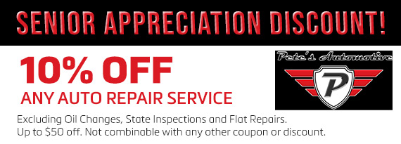 Save money on your next vehicle service with exclusive auto repair coupons and tire deals at Pete’s Tire.